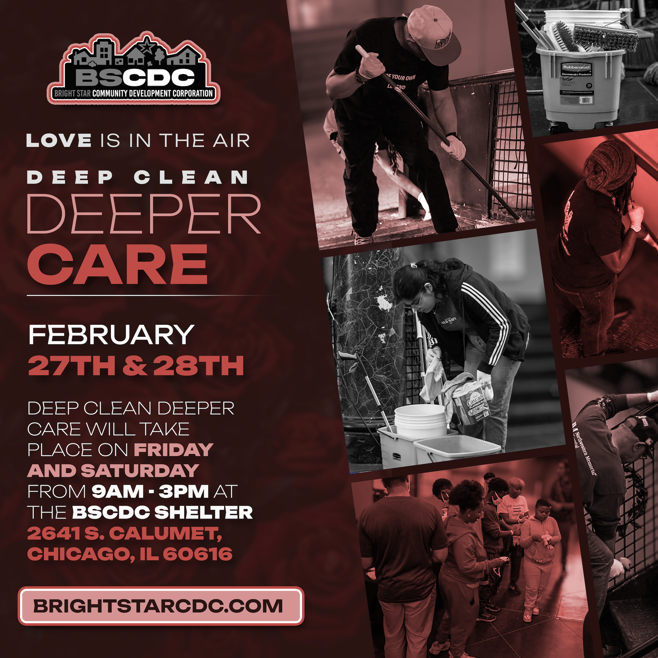Deep Clean Deeper Care is a two-day community service initiative hosted by Bright Star Community Development Corporation, focused on restoring and caring for shared spaces with intention and love. The event will take place on Friday and Saturday, February 27th and 28th, from 9 AM to 3 PM at the BSCDC Shelter, 2641 S. Calumet, Chicago, IL 60616. Volunteers will work together in a spirit of service and community to make a meaningful impact through hands-on cleaning and care. Learn more and stay connected at brightstarcdc.com.